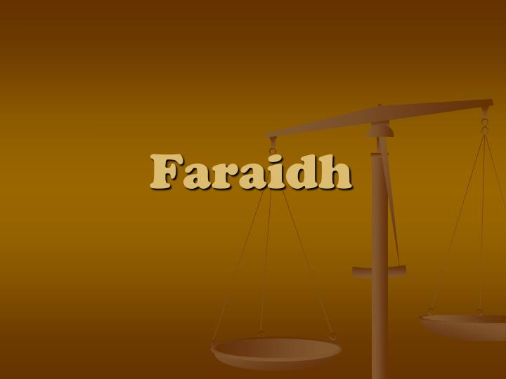 - Menurut Istilah di dalam Syarak, Faraid adalah pembahagian harta pusaka selepas kematian seseorang Islam yang telah di tetapkan di bawah Hukum Syarak ke atas waris-waris yang sah dan layak.