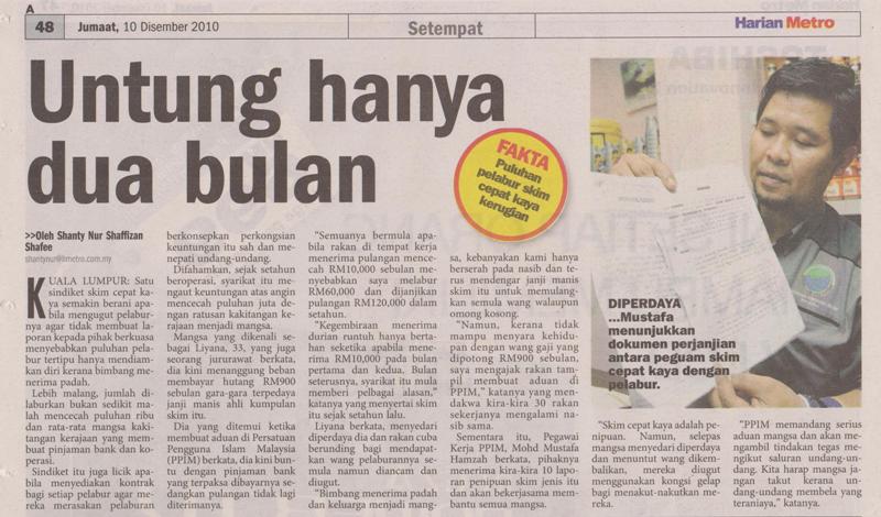 Penipuan dalam kewangan atau skim cepat kaya semestinya sinonim dengan kita semua. Perniagaan ini dikategorikan HARAM dan salah di sisi undang-undang. Skim cepat kaya ialah transaksi yang melibatkan penipuan di dalam aktiviti. Tidak kira samada sengaja atau tidak, ia bertujuan memperoleh keuntungan pada individu atau institusi dan akan merugikan mangsa.